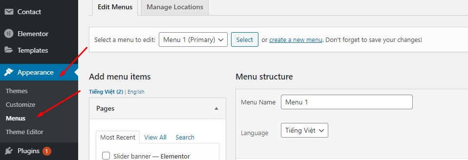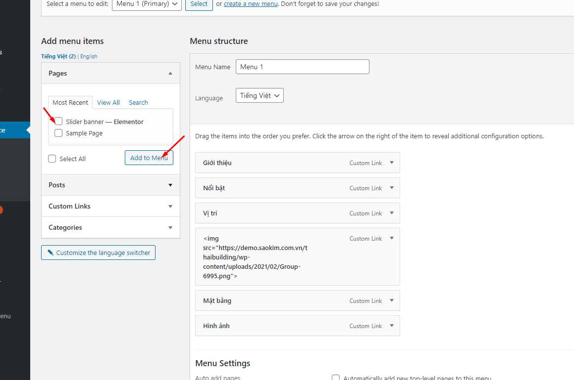 2. Chọn các mục Pages, Posts, Categories,… để có thêm vào menu website. Sau đó kéo thả lên xuống vào vị trí tùy ý